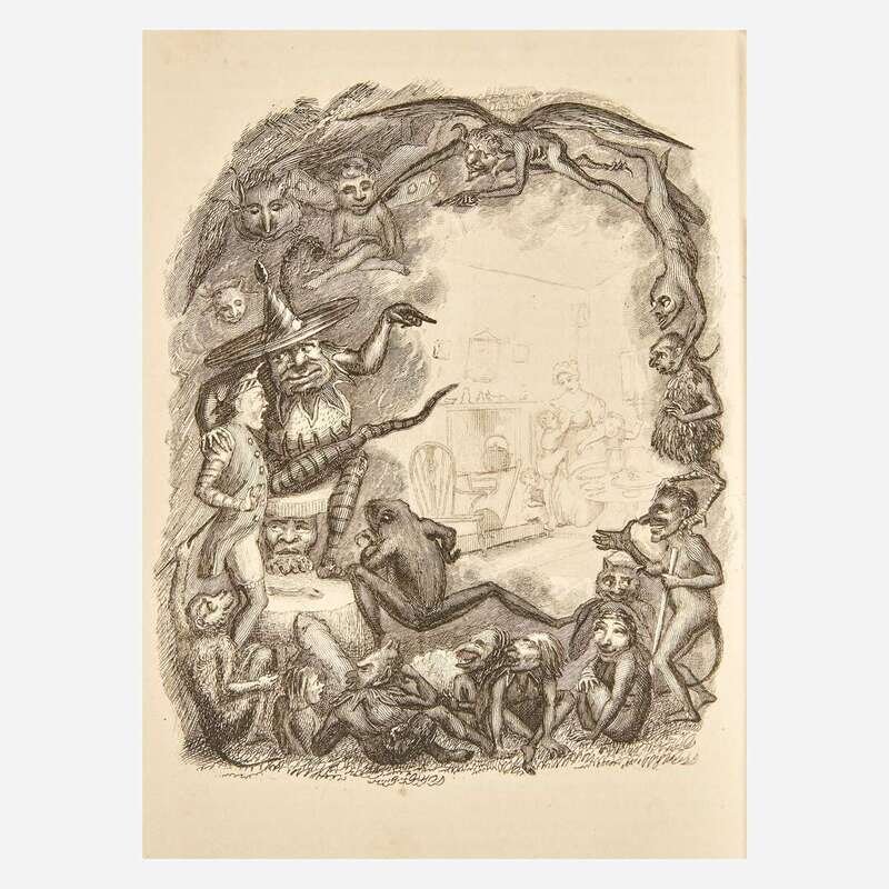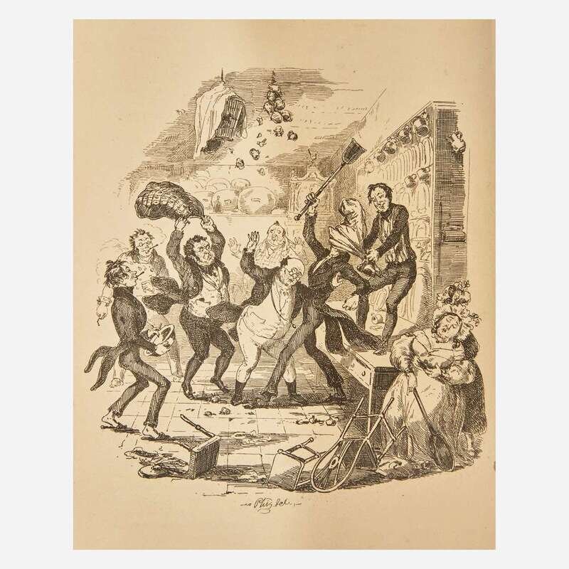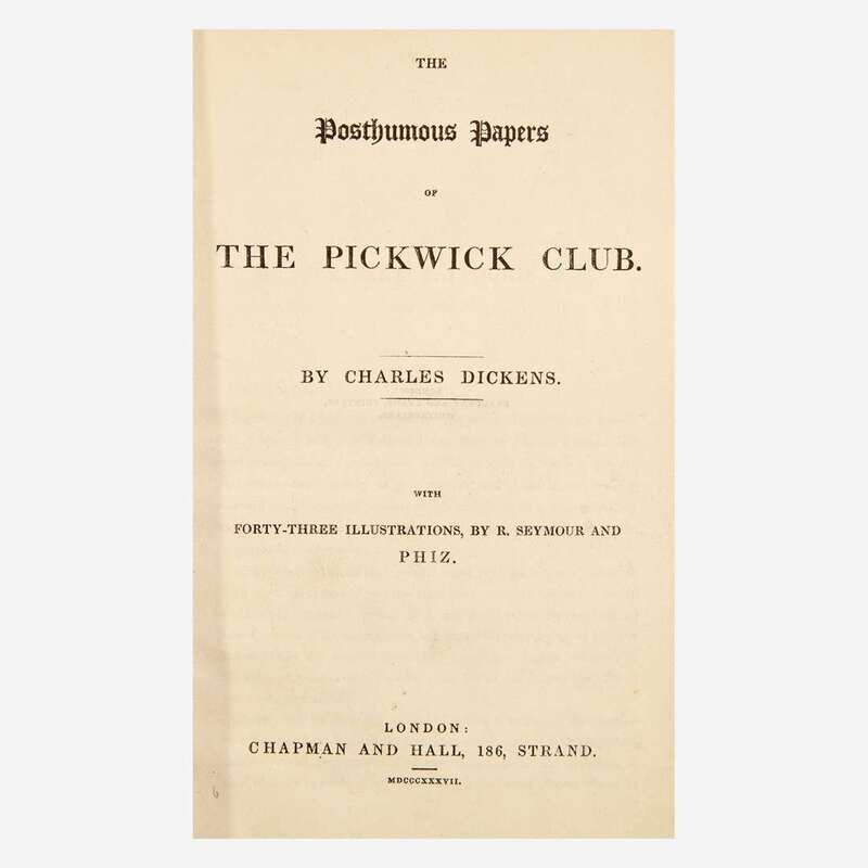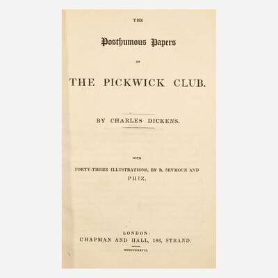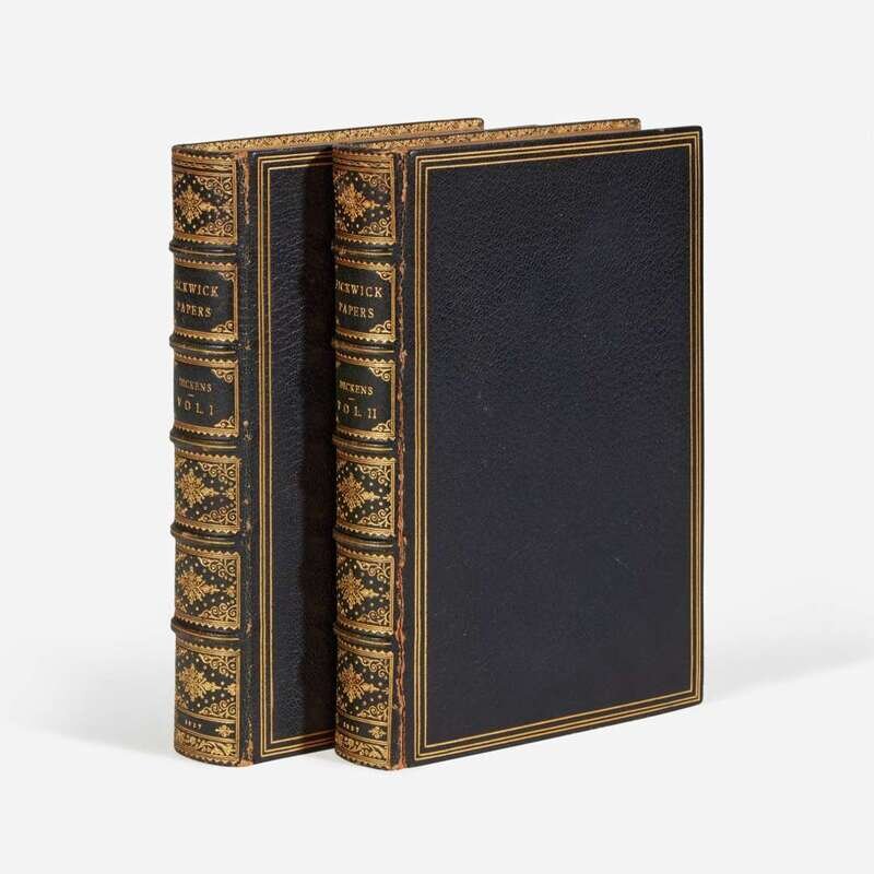London: Chapman and Hall, 1837. In two volumes. First edition, first issue in book form (including all seven of Smith's first issue points). 8vo. xiv, (ii), 306; (ii), 307-609 pp. Extra-illustrated, with two frontispieces (first and second state), two vignette title-pages (first and second state), and 107 plates (in numerous states, many representing all state variations), by Robert Seymour, Robert William Buss, and Hablot Knight Browne, as well as a complete suite of 32 plates by Thomas Onwyn (signed "Sam Weller"). Full crushed navy blue levant, stamped in gilt, gilt dentelles, marbled endpapers, top and bottom front joint of first volume rubbed, corners lightly worn to same, front joint of second volume worn; all edges gilt; by Riviere & Son; scattered minor spotting to text and plates; old ownership signature at head of second vignette title in first volume. Smith I-III; Hatton & Cleaver, pp. 3-88.