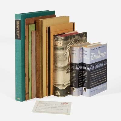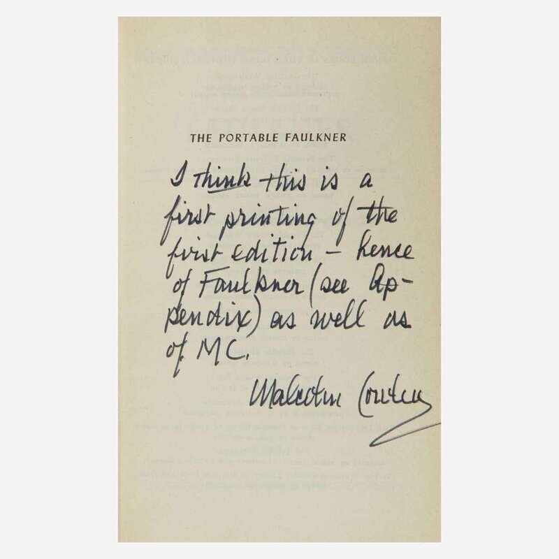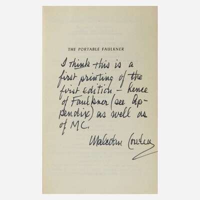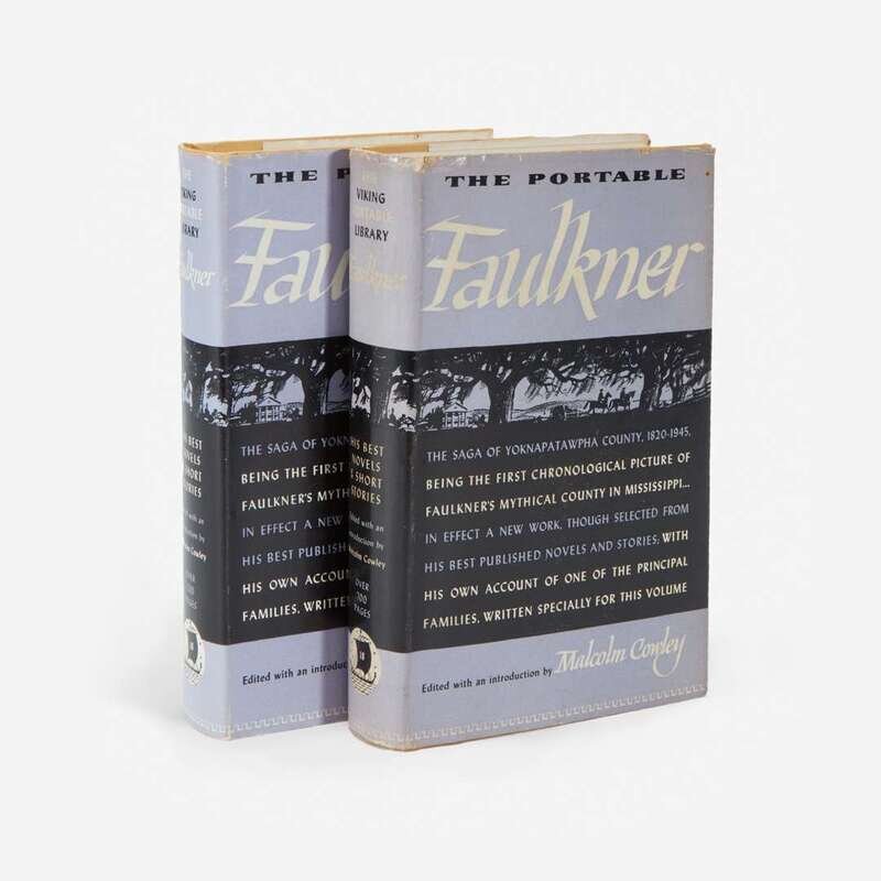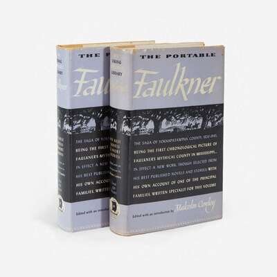 New York: The Viking Press, 1946. First edition, first printing. 12mo. vi, 756 pp. Edited by Malcolm Cowley, and inscribed by him on half-title: "I think this is a/first printing of the/first edition--hence/of Faulkner (see Ap-/pendix) as well as/of MC./Malcolm Cowley". Original yellow cloth, stamped in black and in gilt; all edges trimmed; illustrated endpapers; in original dust-jacket, with three-fold front flap concealing ads. Lot includes an unsigned copy of the same. Petersen A25.1