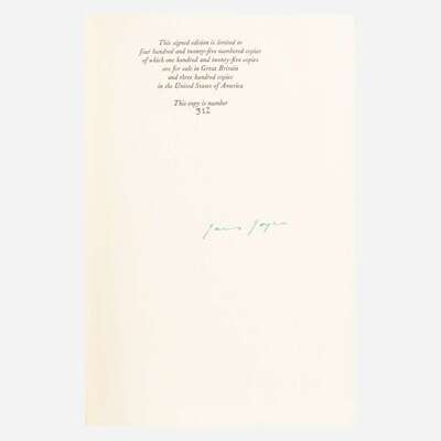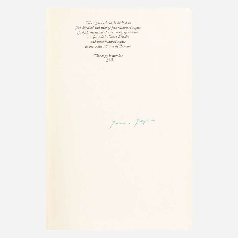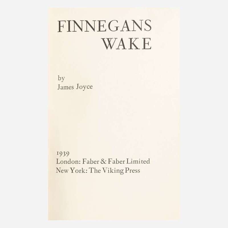 London: Faber & Faber Limited/New York: The Viking Press, 1939. First and limited edition, #312/425 copies signed by Joyce, in green pen. 4to. (vi), 628 pp. From the library of Pulitzer Prize-winning Irish-American author Frank McCourt. Original orange cloth, stamped in gilt, spine lightly faded, small stain on upper front board; top edge gilt, other edges untrimmed; partially unopened; in original yellow slipcase, scattered faint spotting and soiling. A near-fine copy. Slocum & Cahoon 49