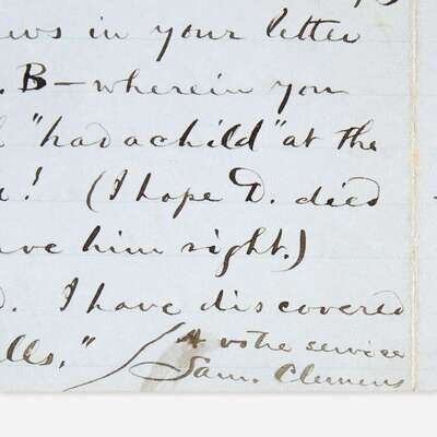 him that, as times were hard, and the a-/mount small, he must lay it out/judiciously. Afterwards, this conversation/took place: Captain--"What-'d ye get?"/Steward--"Fourteen dollars' worth of rum/and a dollars' worth of bread." C.-(Rasp-/ing his words out with indignation almost/too deep for utterance)--"John!--What/--in the--hell--are you--goin' to do--/with--all that bread!" (word scribbled out)/But no matter--Miss Babe gave/me--and so did Miss Pidge--various/messages for you and Stanard--with/discretionary power to alter, amend,/add to, take from or invent--as, in/the plentitude of my wisdom I should/deem advisable--. Of them--of course/--we shall speak at greater length when/I get to St. Louis./But seriously--I blush--and I/not only blush, but I feel alarmed--deeply/concerned--about the news in your letter/referring to Dan & H.B.--wherein you/state that Dan & Habath "had a child" at the/same time." Horrible! (I hope D. died/in child--bed--and serve him right.)/P.S.--I feel relieved. I have discovered/that they only had "chills."/(Illegible) the service/Sam. Clemens/