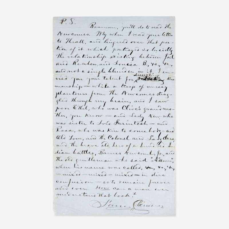 Beaman, you'll do to read the/Newcomes. Why when I read your letter/to Thrall, and lingered over that por-/tion of it which portrayed so lucidly/the relationship existing between Joel/and Reuben, and Louisa B., &c., &c.,/and not a single blunder in it, I en-/vied you your talent for dissecting kins-/manship--while a troop of uneasy/phantoms from the Newcomes strag-/gled through my brain, and I saw/poor Ethel, who was Clive's grandmo-/ther, you know--and Lady Kew, who/was sister to Lord Farintosh--and/Old Tom, and the Colonel and Lady Clara,/and the brave old hero of a hundred In-/dian battles, Barnes Newcome, Jr., and/the old gentleman who said "Adsum,"/when his name was called, &c., &c., &c.,/--mixed--mixed--mixed--in dire/confusion--so to remain forever/and ever. How can a man ever/understand that book?/