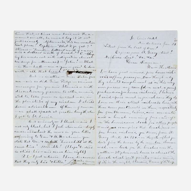 The outbreak of the Civil War would put an end to Clemens's steamboating, as Northern blockades essentially brought the trade to a halt, and this is one of the final known letter's by him while still piloting steamboats.