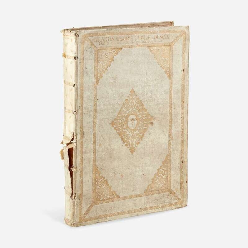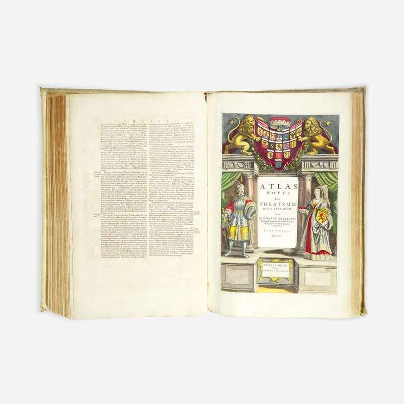 Amstelodami: Ioannem Ianssonium, no date (ca. 1640-60s). Two parts in one volume. Tall folio, 19 1/2 x 12 5/8 in. (495 x 321 mm). Illustrated with two hand-colored engraved title-pages (old color), and 102 hand-colored engraved double-page maps (old color); 62 in first part, 40 in second part. Contemporary full vellum with yapp edges, stamped in gilt, including titling on front board, boards soiled, corners worn, tears in lower spine vellum; text block, including maps, may have renewed stubs; hinges split but holding; lacking front blank; first title-page worn and soiled, remnants of old institutional stamp worn away, loss bottom right corner; printed slips mounted at center of each title-page, as usually found; map 33 (De Zype) in second part present, supplied and mounted on top of different map; scattered separations along folds; scattered edge-wear; variously toned; offsetting from hand-coloring.