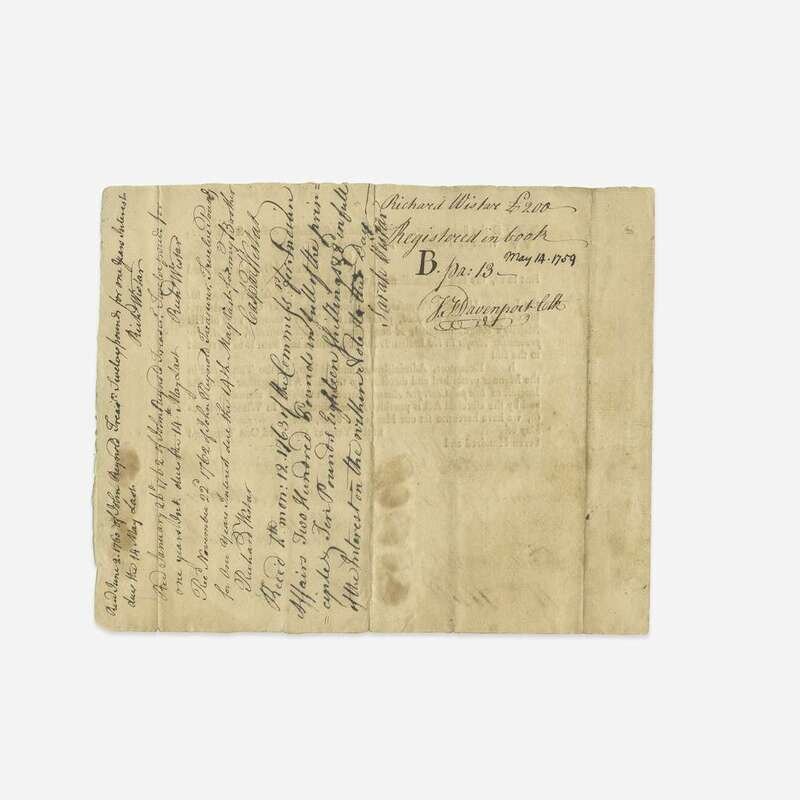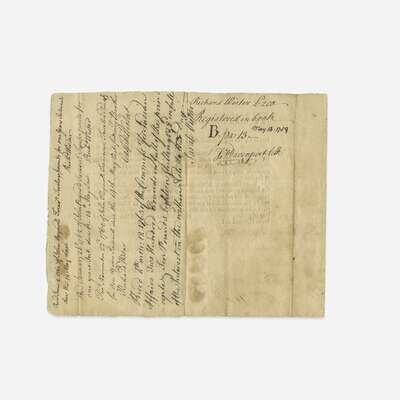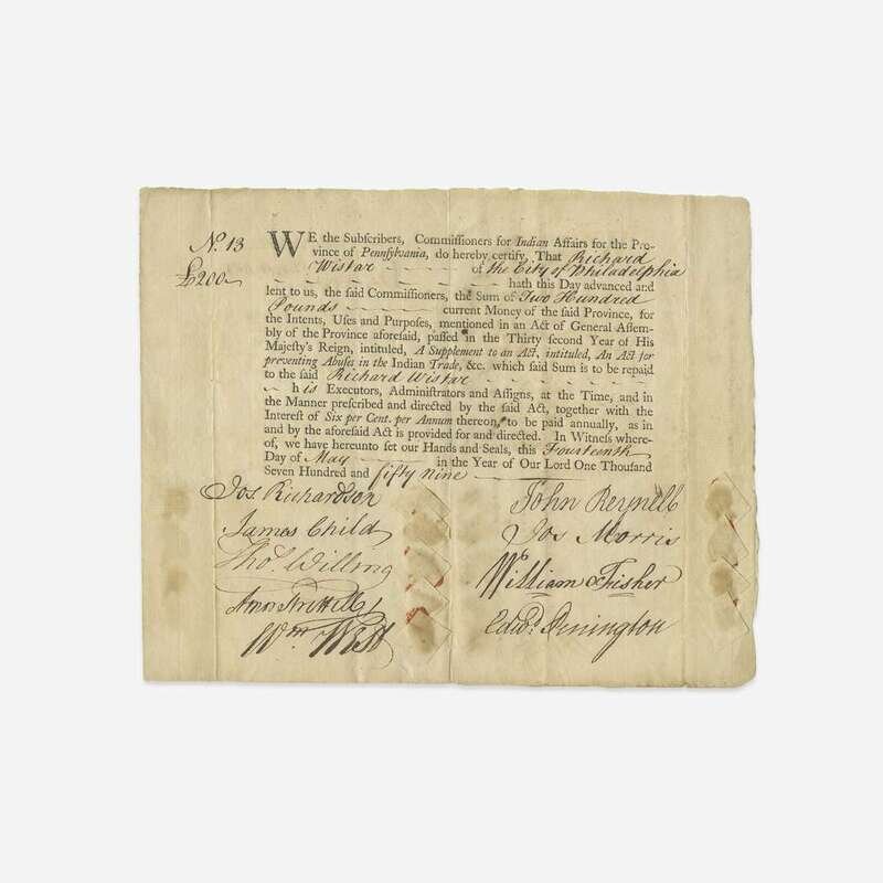 (Philadelphia), May 14, 1759. One sheet, 6 1/2 x 8 1/8 in. (165 x 206 mm). Partially-printed interest-bearing bond for £200 pounds (No. 13), registered to Richard Wistar, and issued and signed by the nine commissioners for Indian Affairs of the Province of Pennsylvania, including Joseph Richardson, Thomas Willing, James Child, Amos Swettell, William West, John Reynell, Joseph Morris, William Fisher, and Edward Pennington; MS. on verso recording yearly interest amounts paid, signed by Wistar, as well as by his brother, Caspar, and his wife, Sarah; docketed on same. Creasing from original folds; lightly toned.