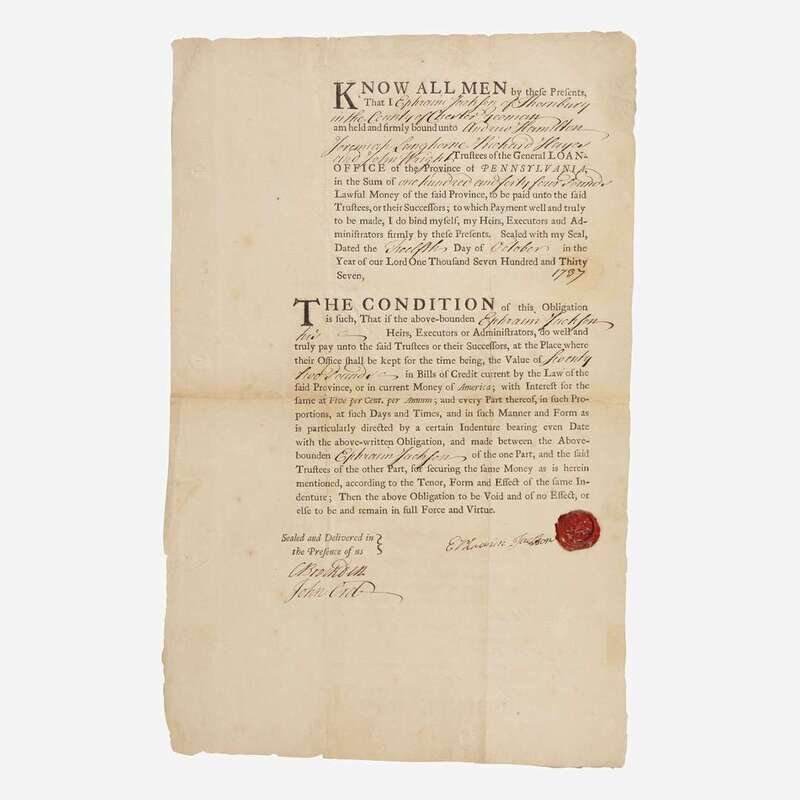 Pennsylvania, October 12, 1737. One sheet, 13 x 8 1/4 in. (330 x 209 mm). Early partially-printed General Loan-Office of the Province of Pennsylvania bond, for an Ephraim Jackson of Chester County, signed by him at bottom, and with his wax seal; counter-signed by a C. Brockten and John Ord. Docketed on verso; creasing from original folds; scattered spotting and edge-wear.
