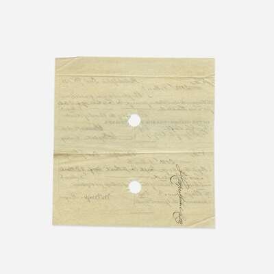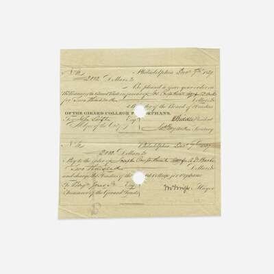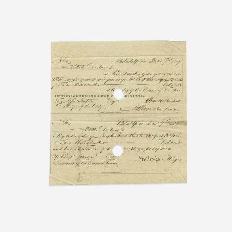 Philadelphia, December, 7, 1837. One sheet, 7 1/4 x 6 3/4 in. (184 x 171 mm). Partially-printed Girard College for Orphans Treasury document made out to Joseph Cowperthwait, cashier at the Second U.S. Bank, for A.D. Bache (future president of Girard College), for $2,000; signed by Nicholas Biddle, as president of the Board of Trustees for Girard; two cancellations holes at center.
