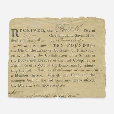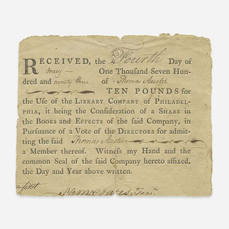 Philadelphia, May 4, 1793. One sheet, 4 1/2 x 5 1/2 in. (114 x 140 mm). Partially-printed shareholder's certificate, issued to Thomas Austie; signed by Samuel Coates, Jr., as treasurer. Creasing from original folds, repaired; lacking seal and bottom portions along folds.