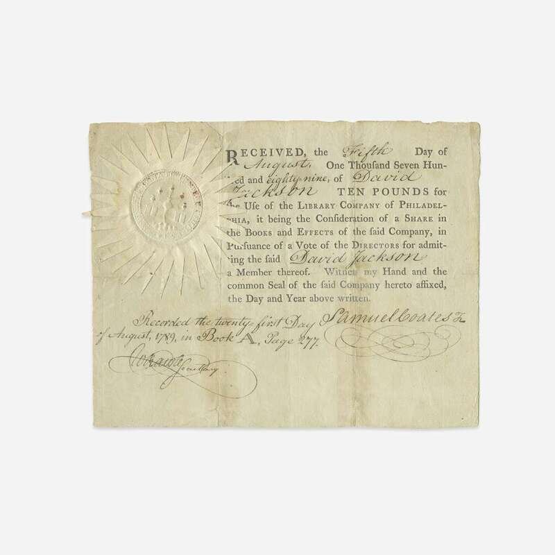 Philadelphia, August 5, 1789. One sheet, 6 1/2 x 8 1/8 in. (165 x 206 mm). Partially-printed shareholder's certificate, issued to American physician and Pennsylvania delegate to the Continental Congress, David Jackson (1747-1801); signed by Samuel Coates, Jr. (1748-1830), as treasurer; elaborate paper seal intact. Creasing from original folds, restored.
