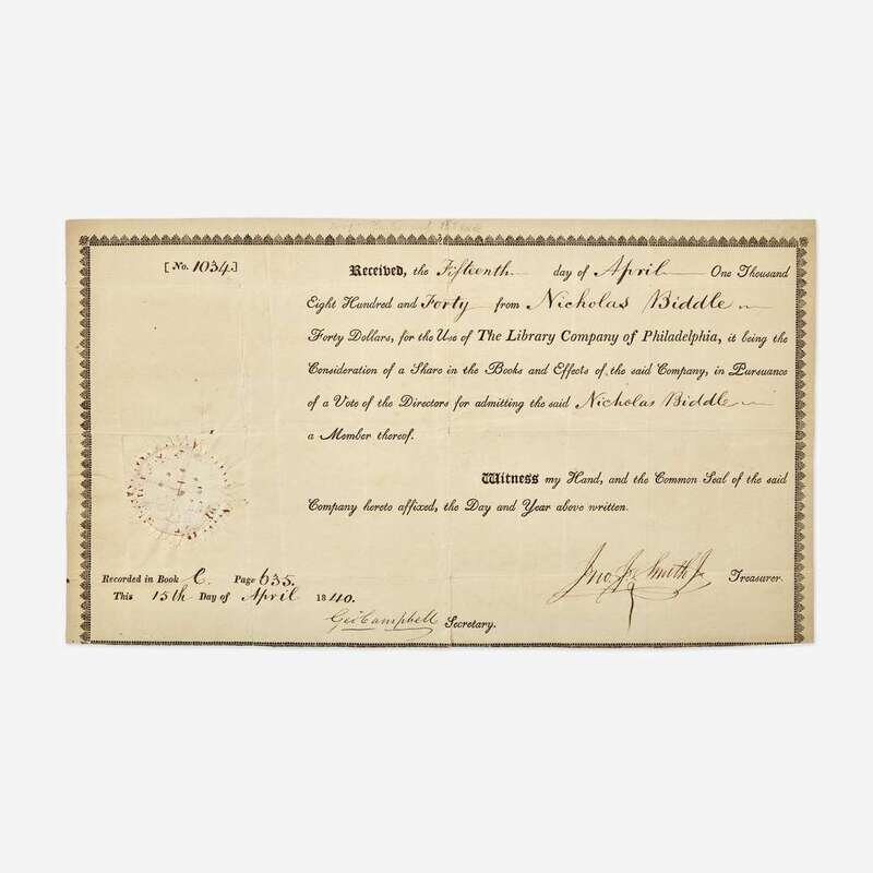 Philadelphia, April 15, 1840. One sheet, 7 1/4 x 12 3/4 in. (184 x 324 mm). Partially-printed shareholder's certificate, issued to American financier and last president of the Second Bank of the United States, Nicholas Biddle (1786-1844); signed by John Jay Smith, as treasurer, as well as George Campbell, as secretary. Creasing from original folds, sello-tape repairs on verso.