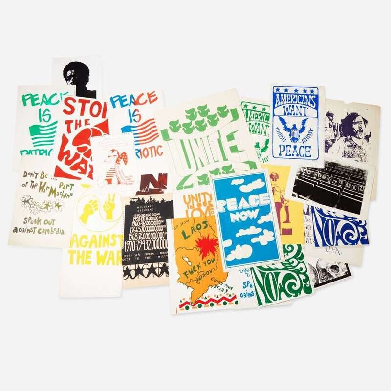 These rare and impressive posters are very rarely, if ever, seen together in such a large grouping (43) on the market, and they provide a visual record of a very American protest language that sprung up quickly--and faded just as quickly--in the social and cultural conflagrations at the dawn of the new decade, one that would see five more devastating years in Veitnam, as well as the resignation of a president.