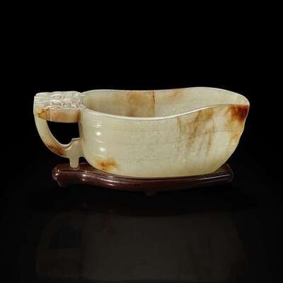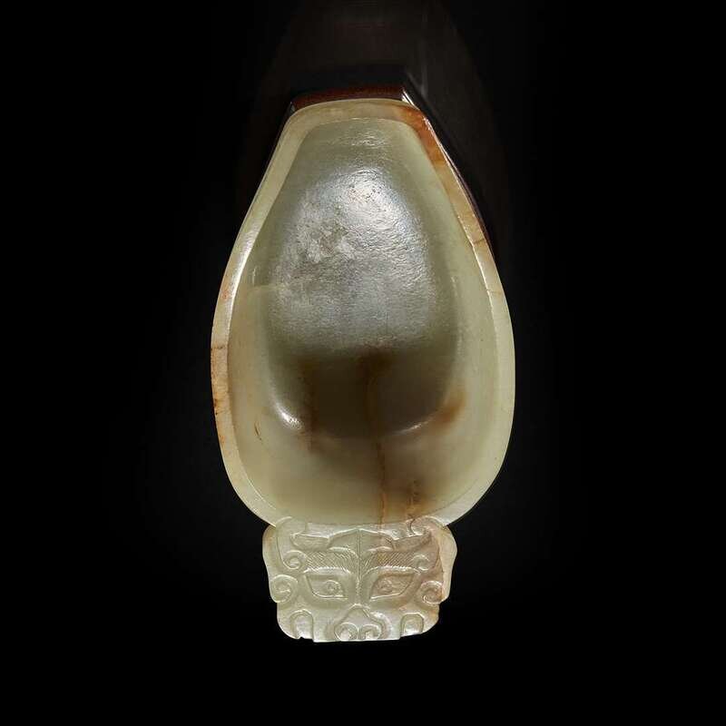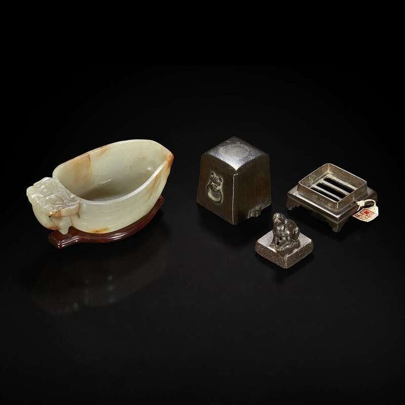 A Chinese pale celadon jade archaistic libation cup and a bronze rabbit seal 玉匜与铜兔印章一组 The jade 17th/18th Century, the seal possibly Yuan dynasty ?????????? ??????