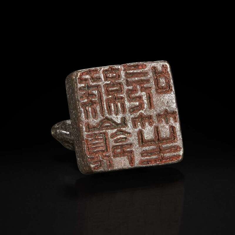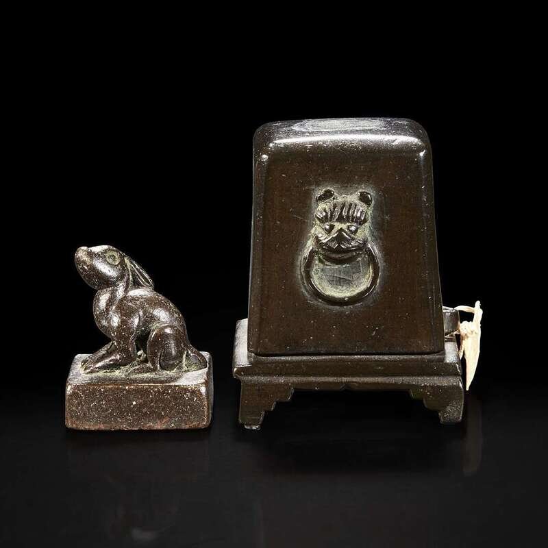 The jade with a beast mask, continuous fret pattern to the rim, with later wood stand; seal top cast as a seated rabbit, with associated stand and cover, possibly original, the cover with taotie mask and ring motif to the sides, old lables to both