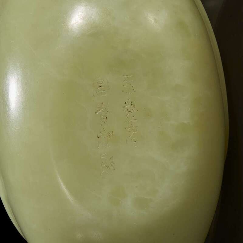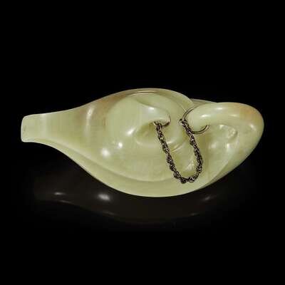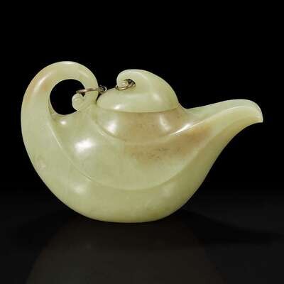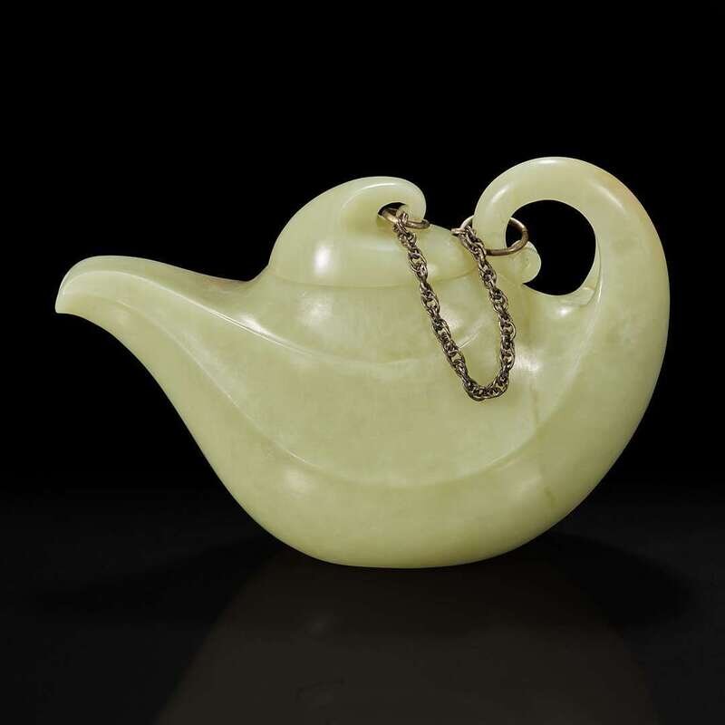 Elegantly carved of scrolled oil lamp form and design, the teapot and cover linked by a metal chain, the underside inscribed with seven-character Chinese mark which may be translated as "Wealth and good fortune jade teapot".