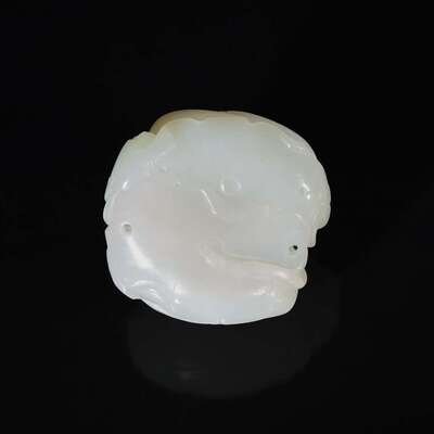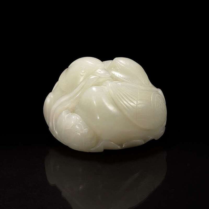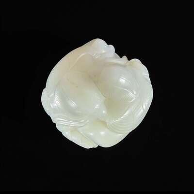 A Chinese white jade figural group depicting mandarin ducks 白玉雕双凫衔荷花 Qing Dynasty ?