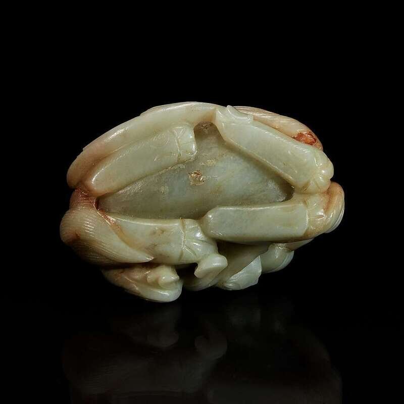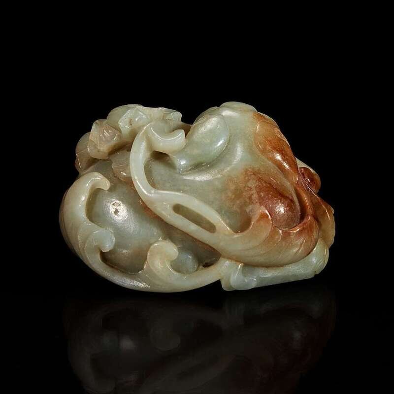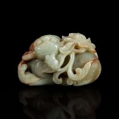 A Chinese greyish-celadon and russet jade recumbent beast and lotus group 青玉雕瑞兽衔荷花 18th century or earlier ???????