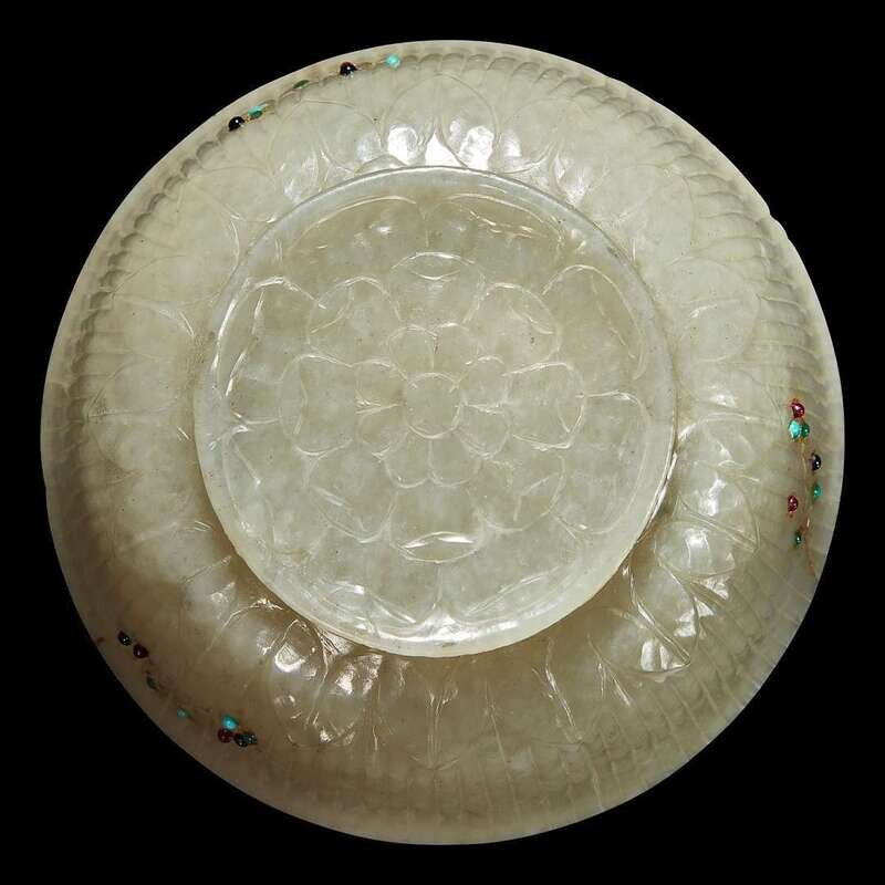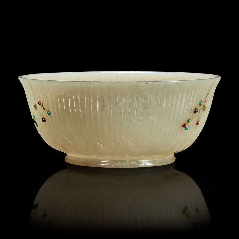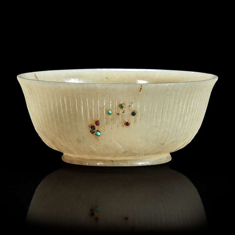 A Mughal-style embellished greyish jade small bowl 痕都斯坦风格灰玉嵌多宝小碗