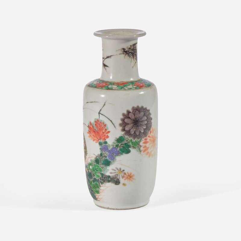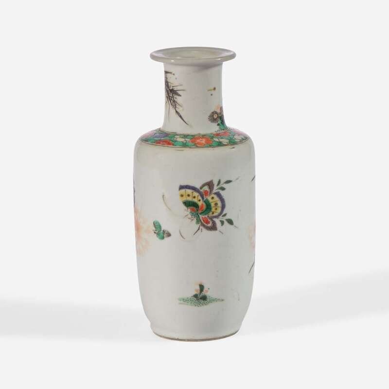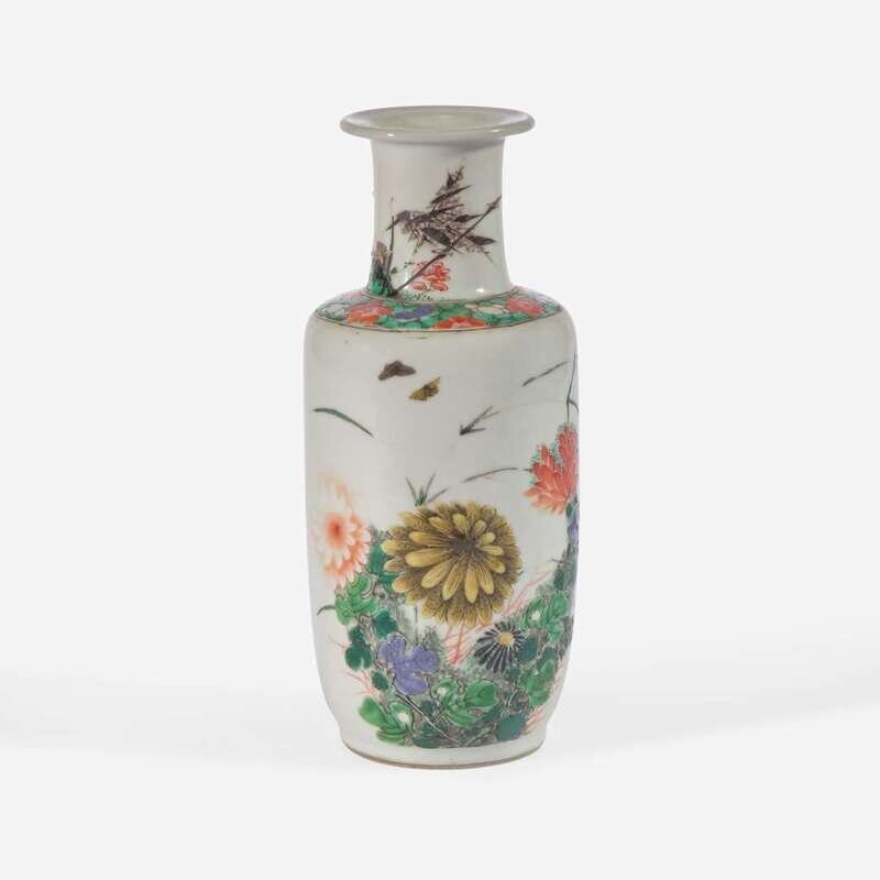 A small Chinese famille verte-decorated porcelain rouleau vase 五彩纸槌瓶