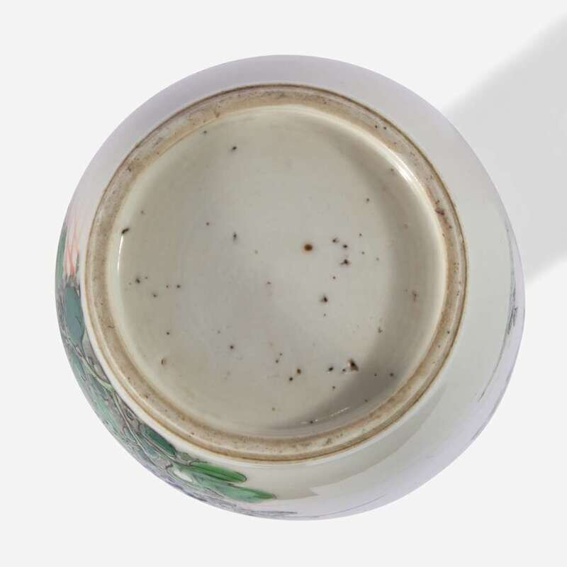 The body painted with flowers and butterflies, shoulder with blossoms on "cracked ice" ground, black bamboo and flowers to neck.