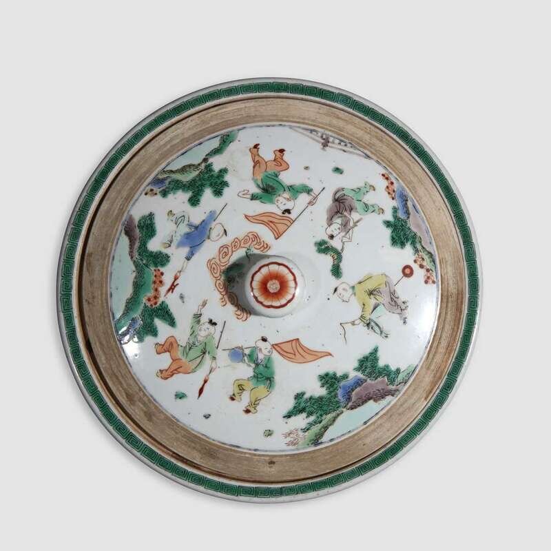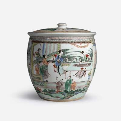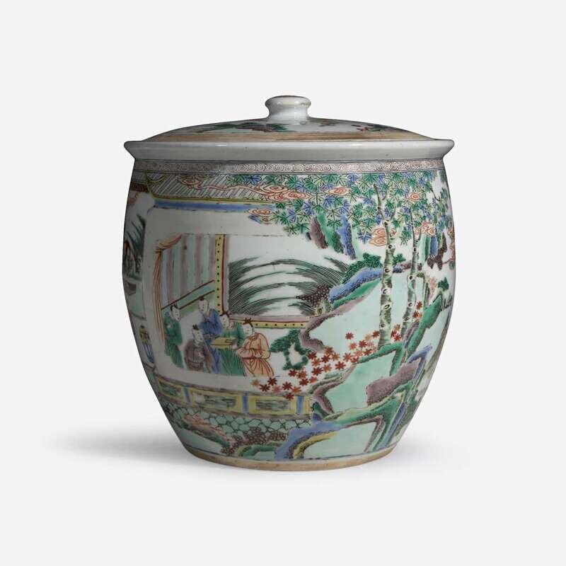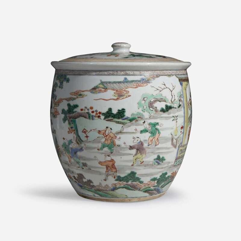 An unusual large Chinese famille verte-decorated porcelain jar and cover 五彩带盖大罐