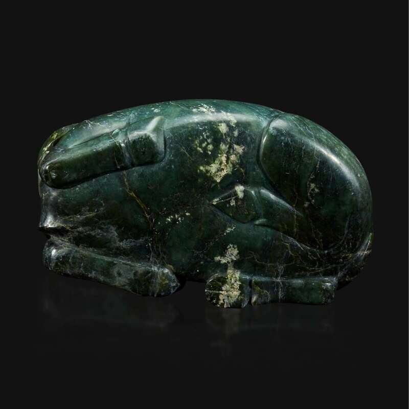 Seated with legs tucked under the body and head turned to one side, the stone of a deep green tone with natural fissures and inclusions.
