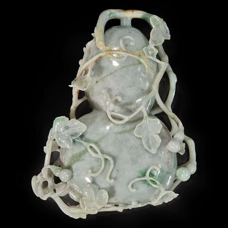 Finely carved as a double gourd among intertwined branches with blooming flowers, leaves, and small gourds, carved with a beetle, cicada, and bird; the jadeite of mutiple colors including white, green, and russet.