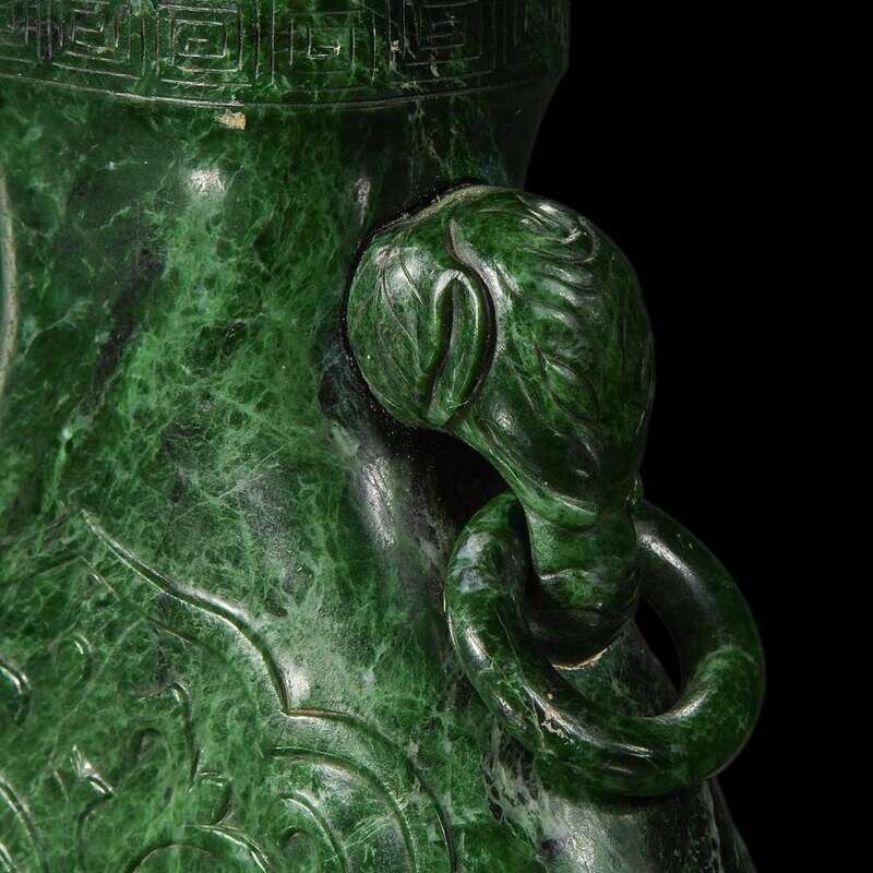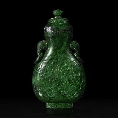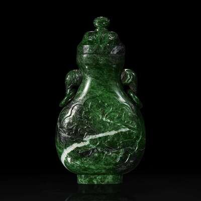 A Chinese carved chloromelanite vase and cover 玉盖罐