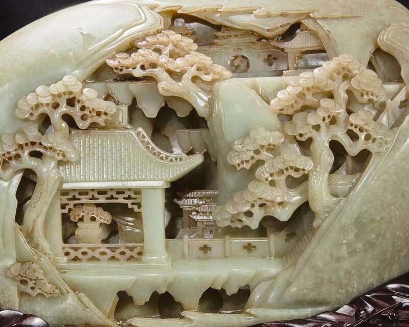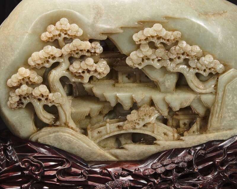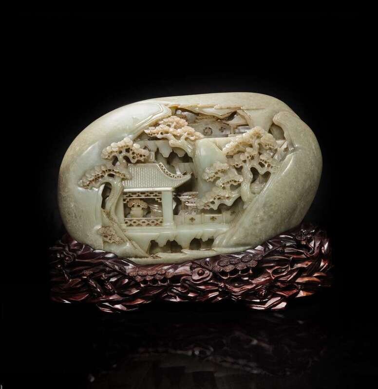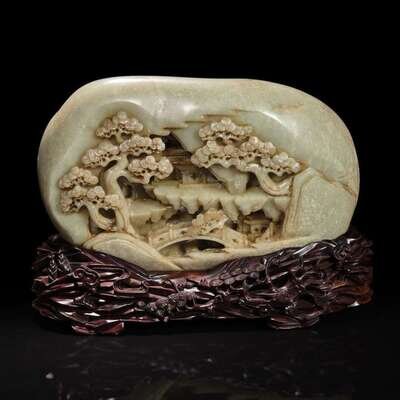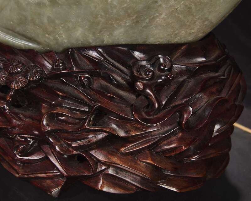 One side of the oval boulder depicting a terraced pavilion among pines, and rockwork; the otherside with similar pavilions and a bridge; the wood stand carved with pine, rockwork and lingzhi sprays.