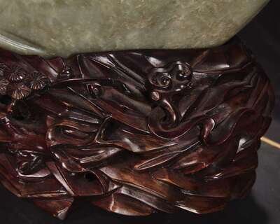 A large Chinese carved greyish celadon jade "Mountain" boulder and carved wood stand 灰青玉山子带底座