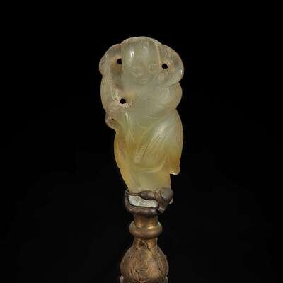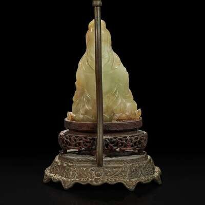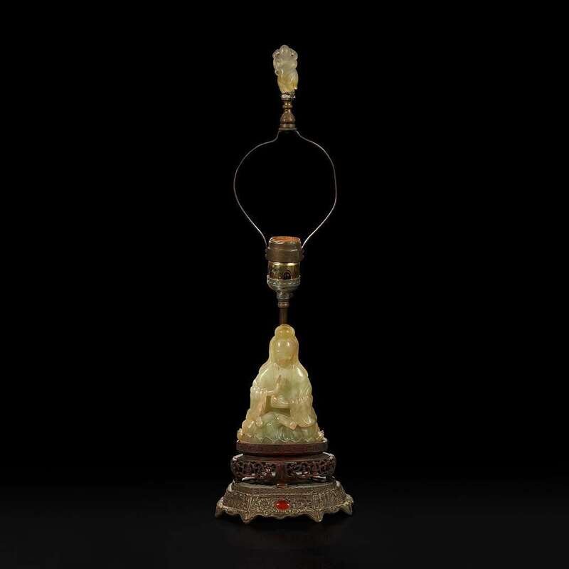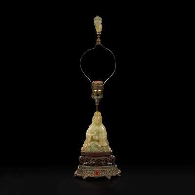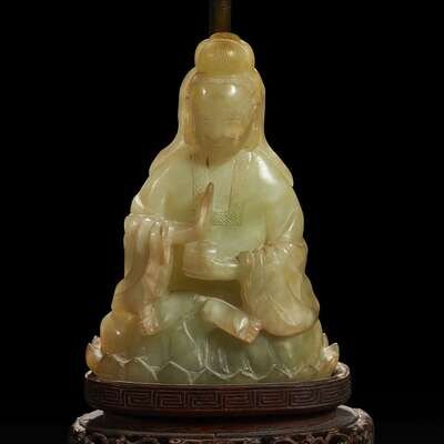 A Chinese carved mottled celadon jade figure of Guanyin, mounted as a lamp 玉雕观音改装台灯