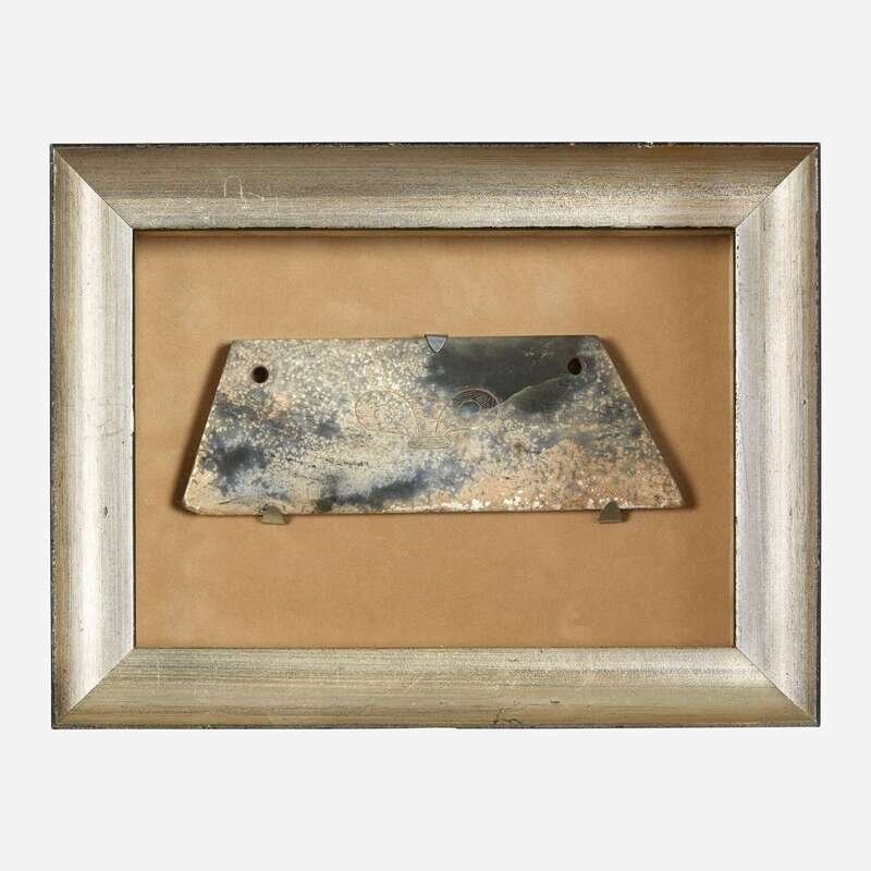 Decorated with Taotie mask pattern, with two drilled holes to the top; mounted in a shadowbox frame, glazed.