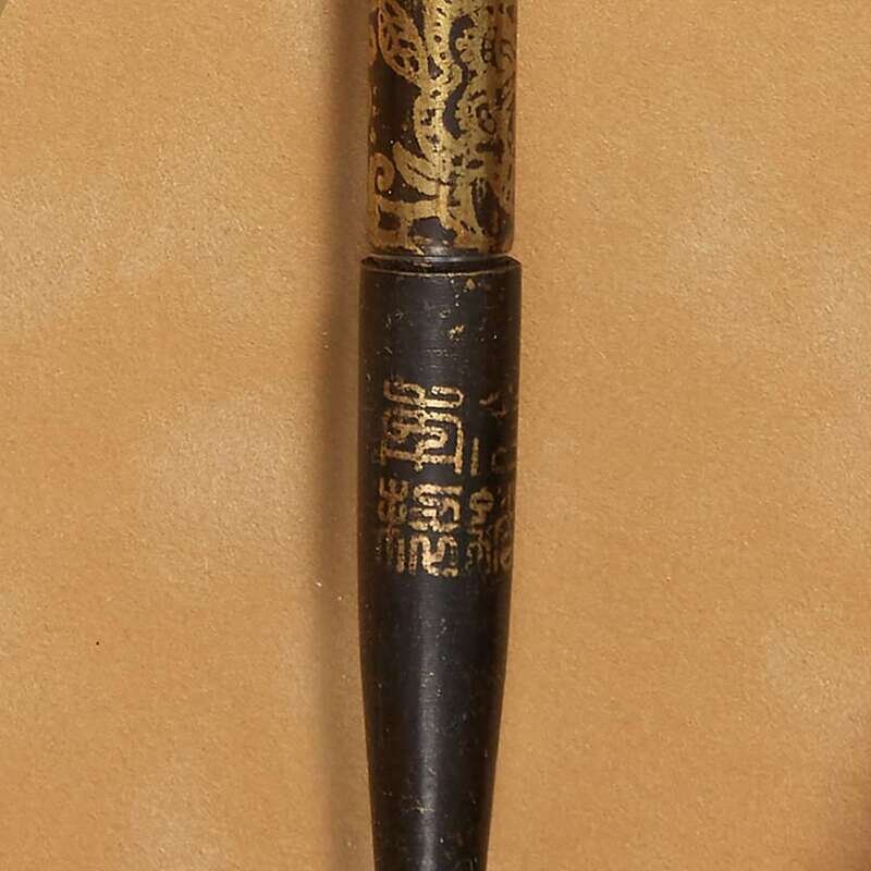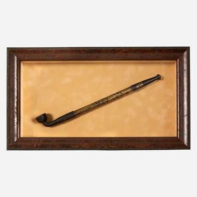 The body decorated with gold-tone scrollwork and four Chinese characters to the mouthpiece, in a shadowbox frame.