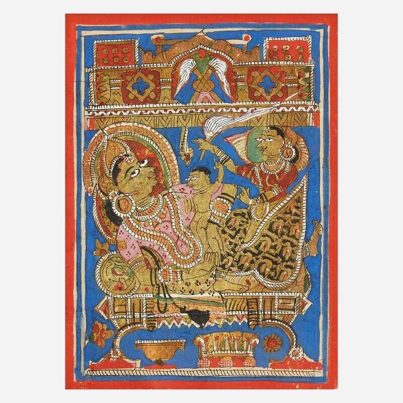Ink, opaque colors and gold on paper, Probably from a Jain Kalpasutra, possibly depicting the birth of Mahavira; framed, matted, and glazed.