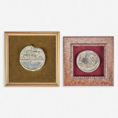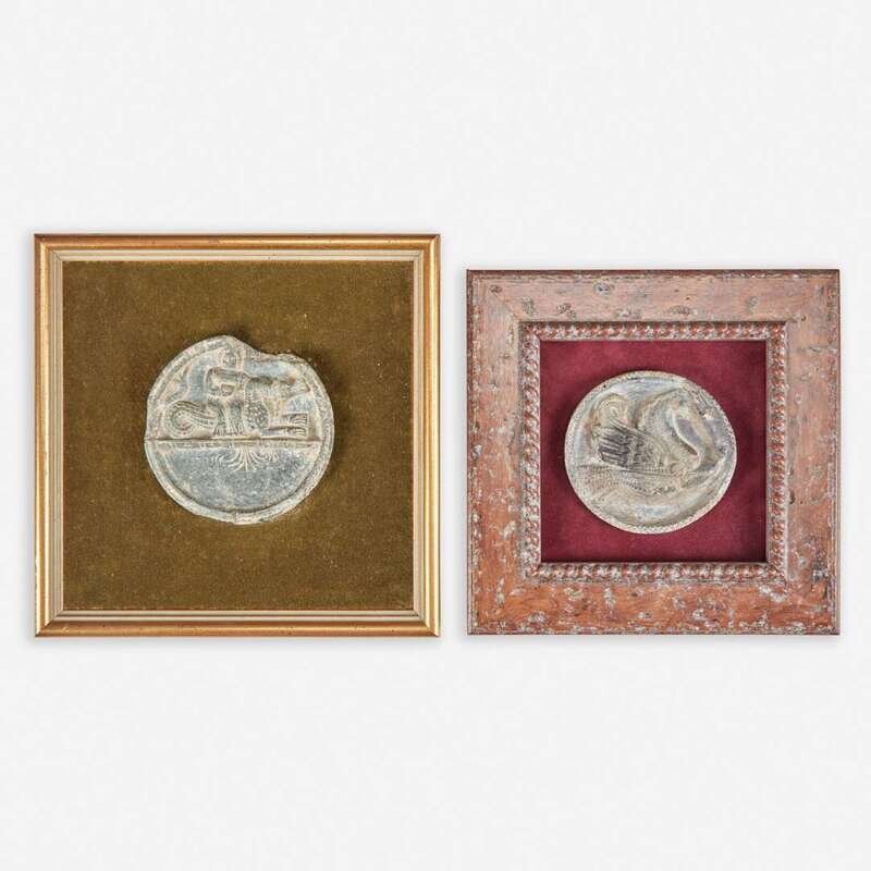 The larger carved with a man riding a lion-headed sea monster, the smaller one carved with a winged horse-like mythical beast, attached to plush backing, framed.