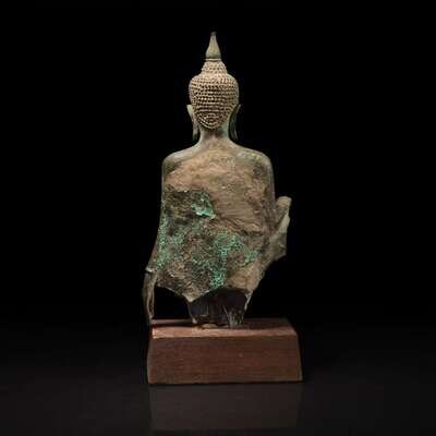 Wearing samghati, his face with lowered eyes, elongated earlobes, curled hairdress and usnisha, on a later wood stand.