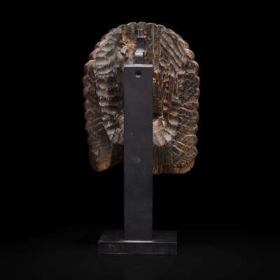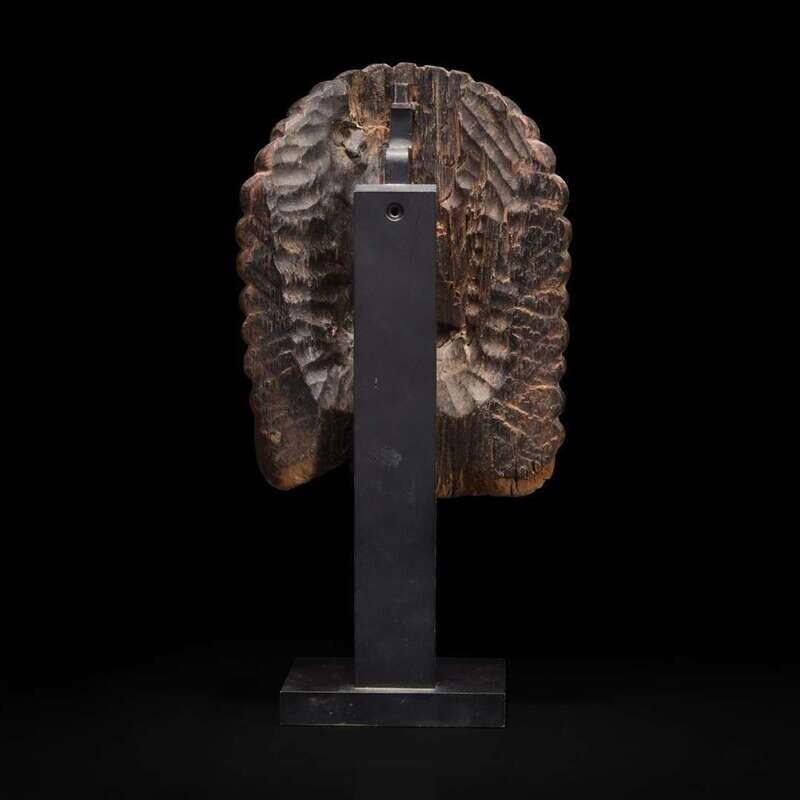 With fierce visage, elaborate diadem, tall curled hair with sun and moon in the locks, traces of pigment, modern metal stand.