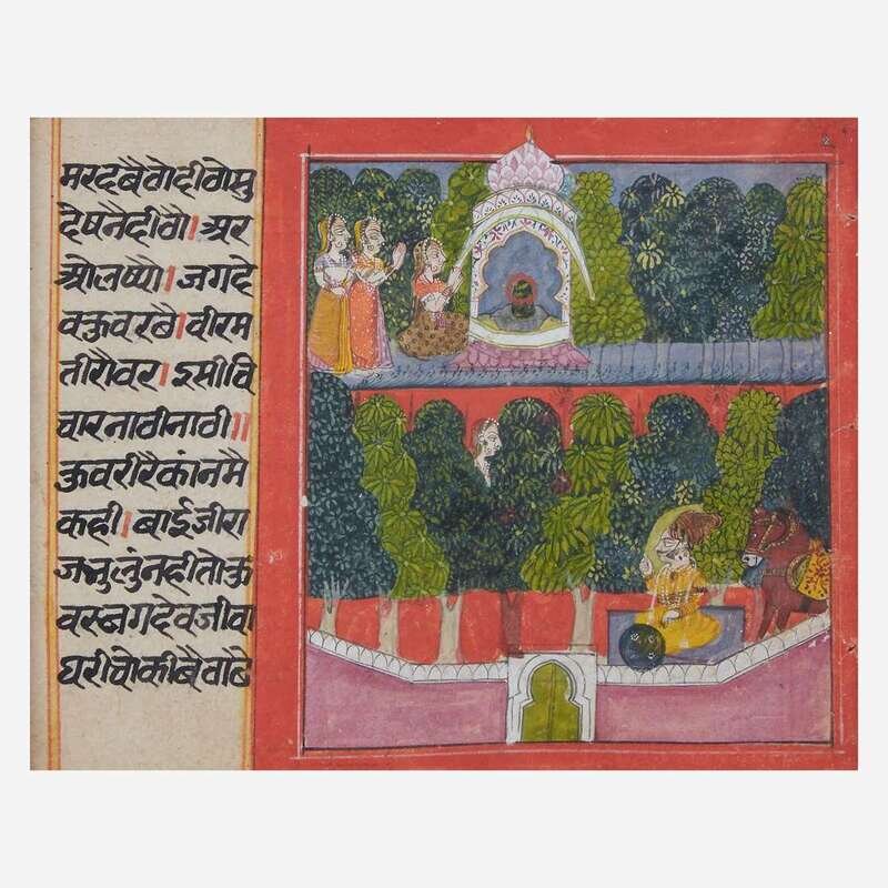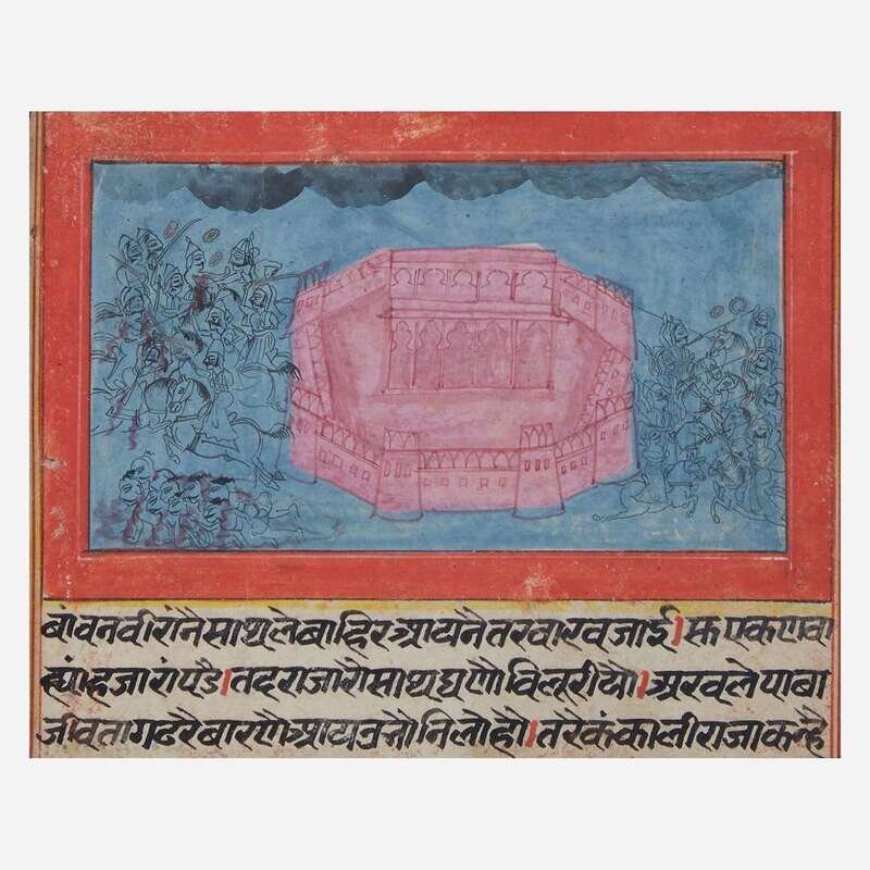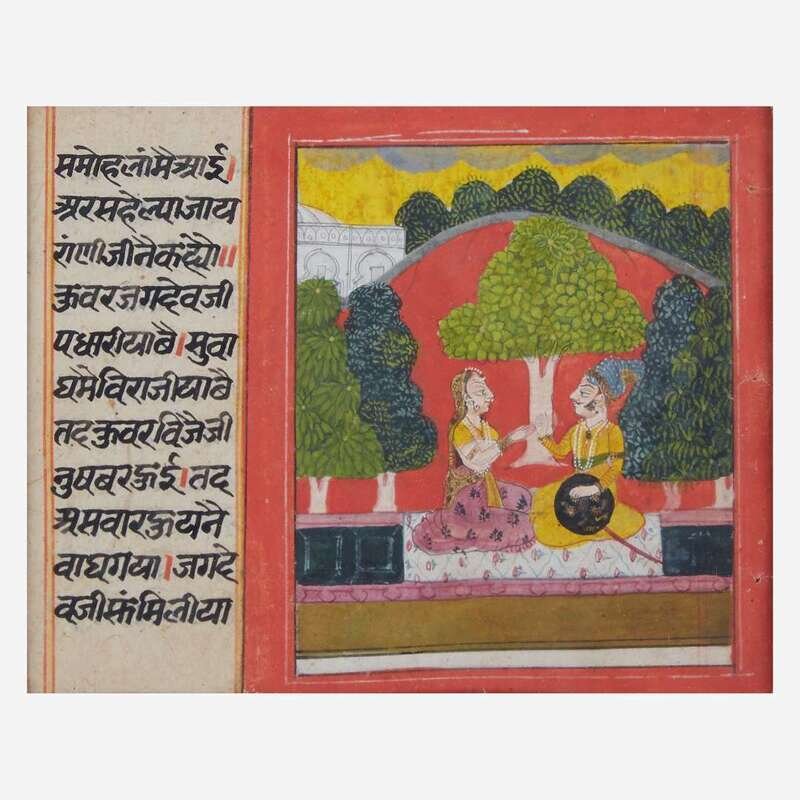 One depicting a prince and consort in a garden; the second a warrior about to enter a circle of dancing women; the third women worshipping a Shiva Linga, above a woman watching a seated prince; the fourth a battle scene outside a fort; framed, matted and glazed.