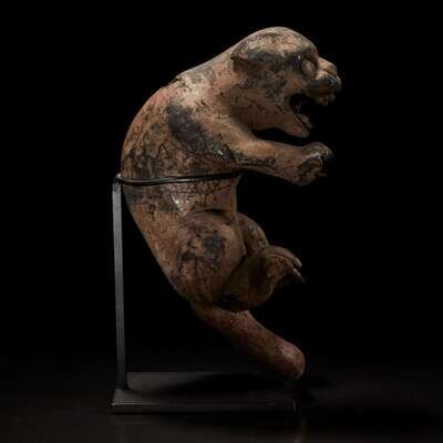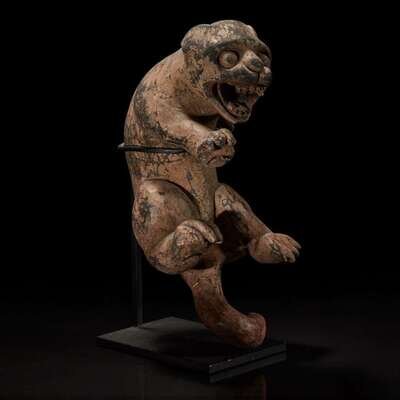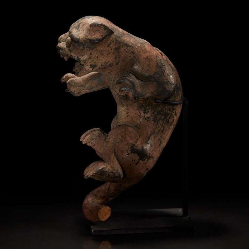 A carved and painted wood figure of a rampant feline 木雕大猫
