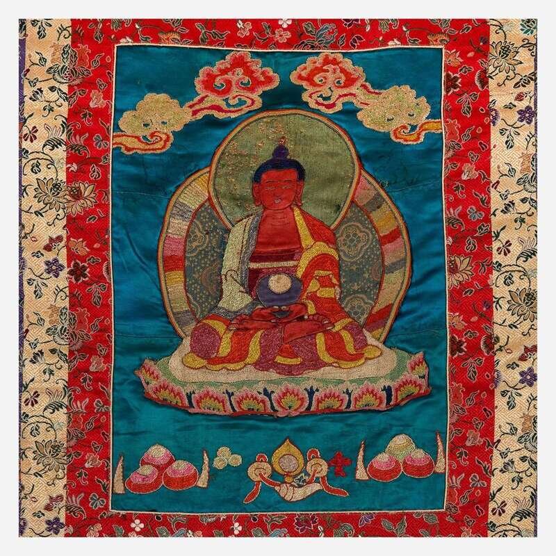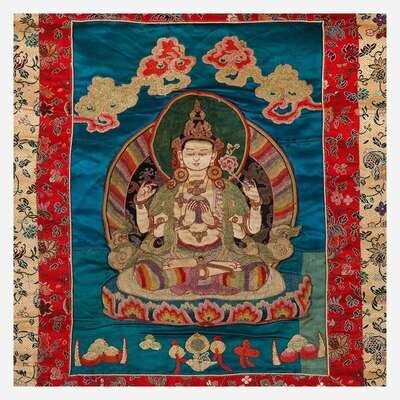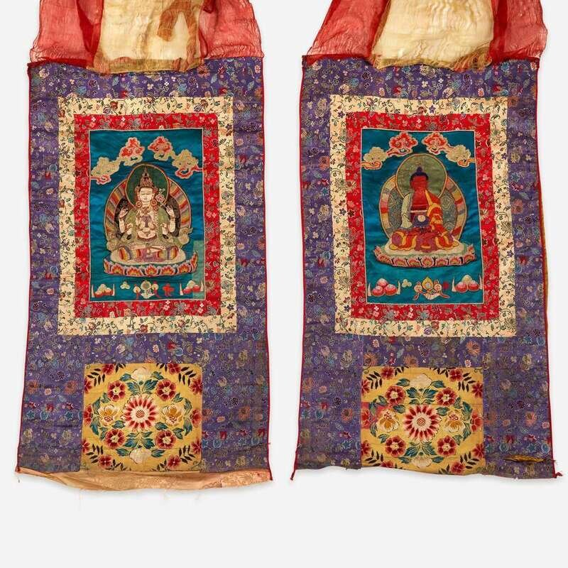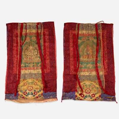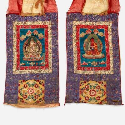 A pair of Tibetan or Nepalese needlework and appliqued silk thanka 西藏或尼泊尔唐卡两幅