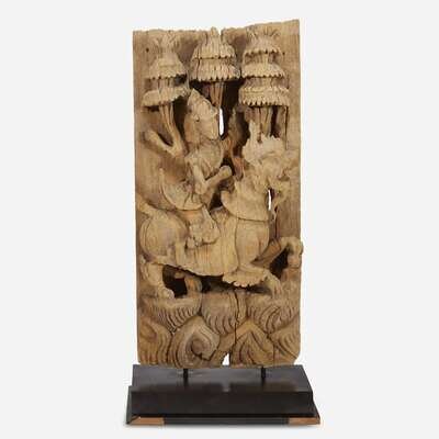 A Burmese carved wood figure of a Nat mounted on a chinthe 缅甸木雕 19th century or earlier ???????
