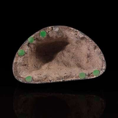 Wearing robes draped over one shoulder, his right hand in bhumisparsa mudra, the hair arranged in tight curls and rising to a flame-shaped ushnisha.