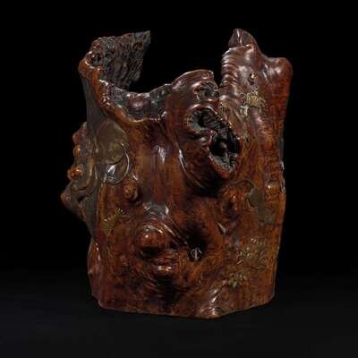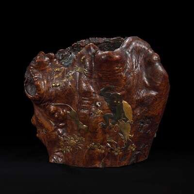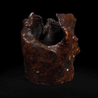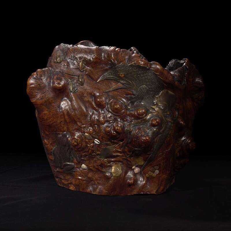 An unusual and large Japanese embellished rootwood hibachi 日本百宝镶嵌根雕 Meiji period ??
