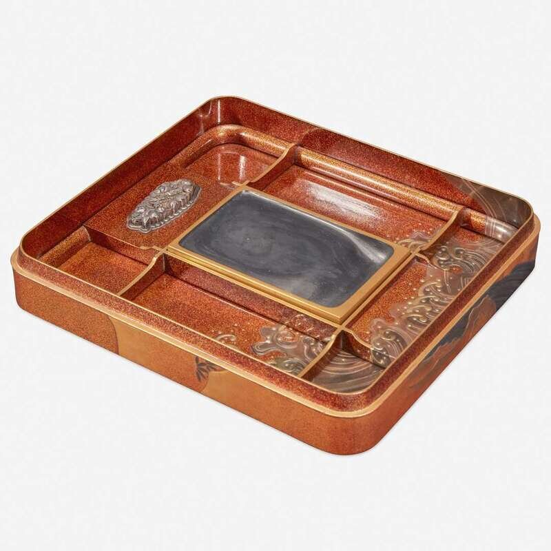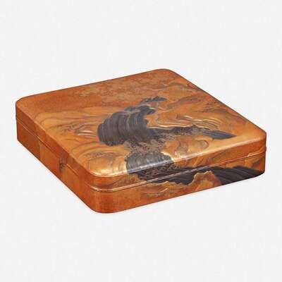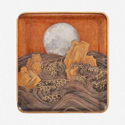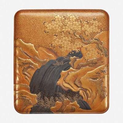Decorated in hiramaki-e, takamaki-e, togidashi and kirigane with flowering cherry tree, rushing stream and waterfall in a rocky landscape against a nashiji ground to the exterior, interior of the cover decorated with a full moon behind crashing waves and a stylized rendition of the Meoto Iwa ("Married Couple Rocks"); insert with crashing waves, fitted with an inkstone and a silver water dropper finely modeled with peony blossoms.