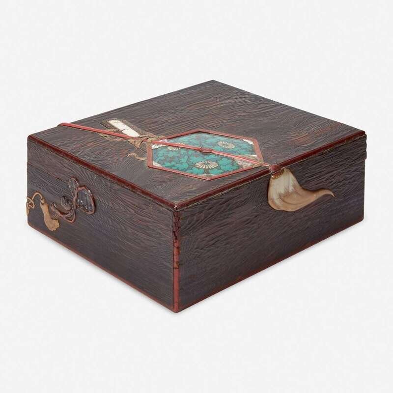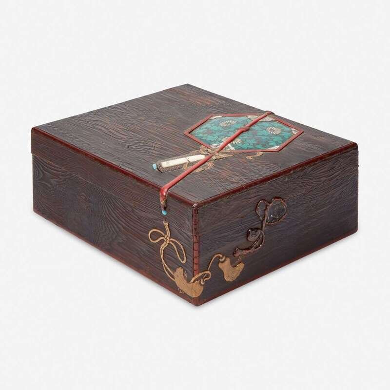 Of rectangular shape, the boldly textured wood box embellished with inlaid fan with flywhisk, scroll, tassle and lingzhi sprig in cloisonné, mother of pearl, carved lacquer, glass and hardstone, interior with gold-speckled roiro lacquer, unsigned.