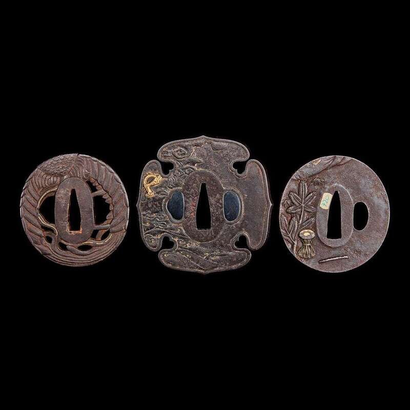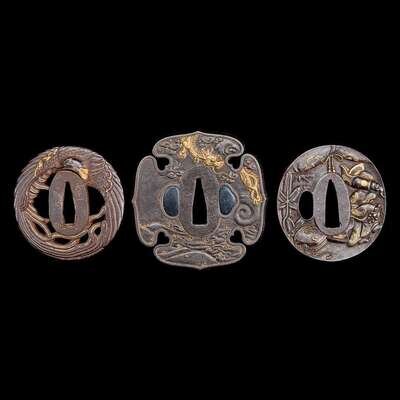 A group of three Japanese gold-inlaid iron tsuba, one signed 日本嵌金刀镡一组三件 一件带签字 Edo to early Meiji period ?????