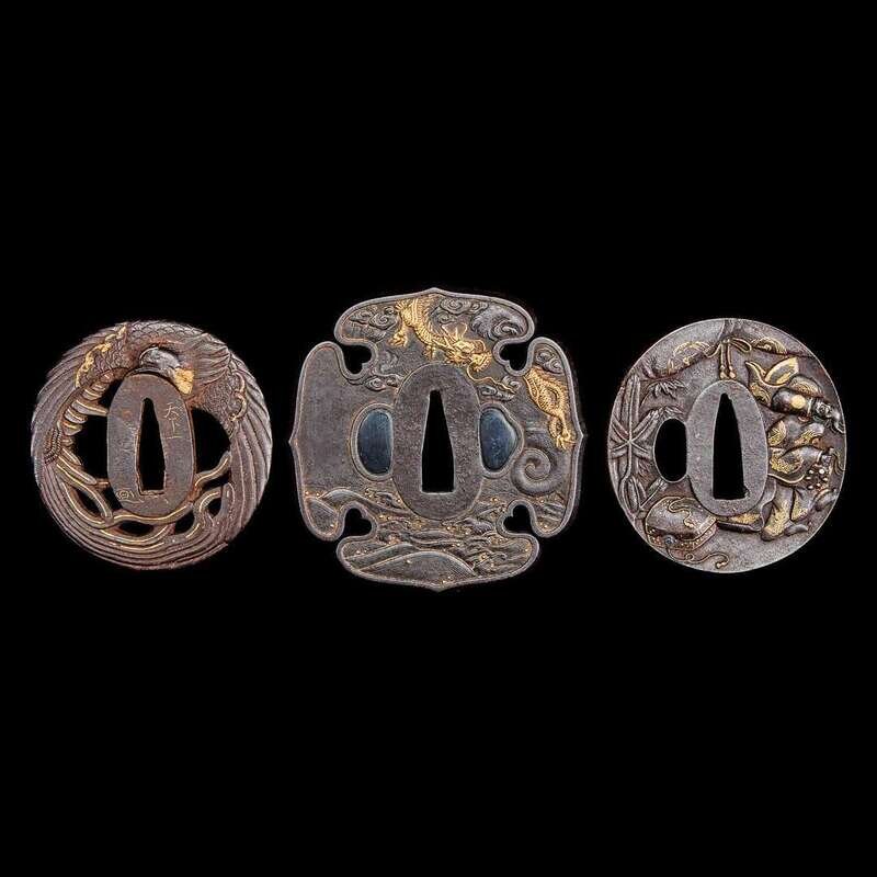 Comprising on oval example with a Noh dancer, possibly Okina,verso with drum, flute, pine and drapery; the second of lobed quadrangular form, with gold dragon flying over waves; the last oval, with a parcel-gilt ho-o bird, incised and gold-inlaid inscriptions.