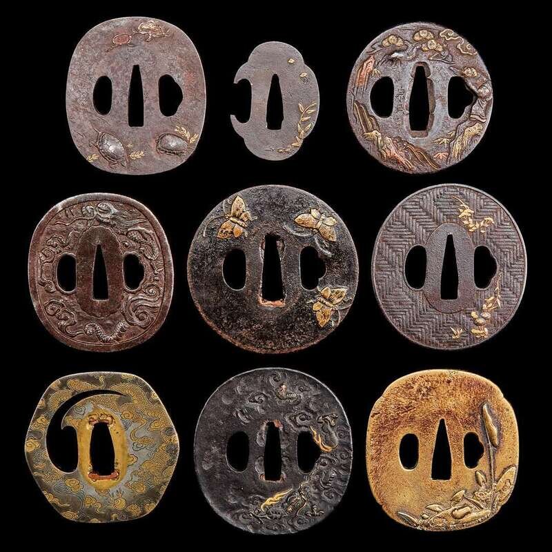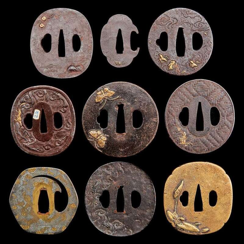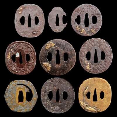 A group of nine assorted Japanese iron, brass, and soft metal tsuba 日本刀镡一组九件 Edo-Meiji period ?????