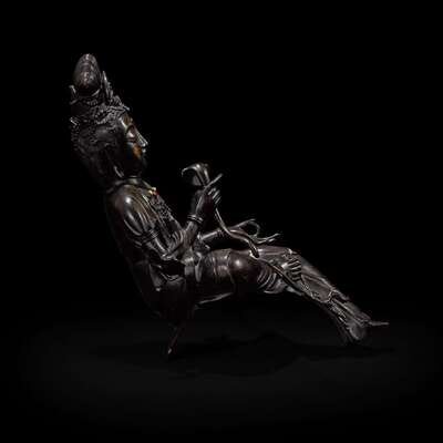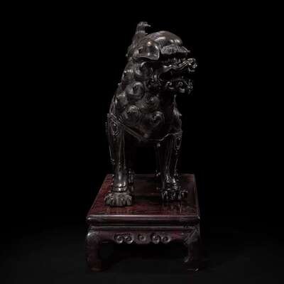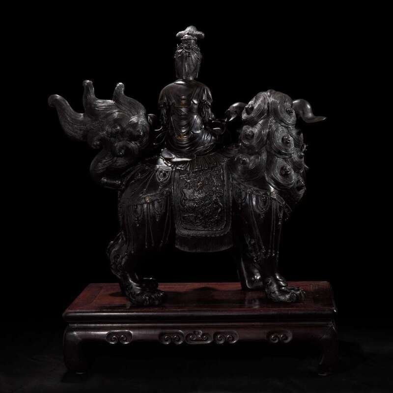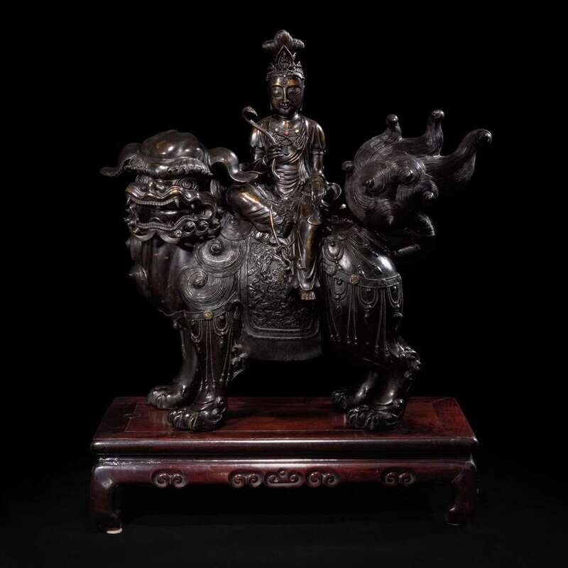 A large Japanese patinated bronze figural censer depicting a Bodhisattva on a lion 日本铜加漆菩萨骑狮像 19th/20th century ???????