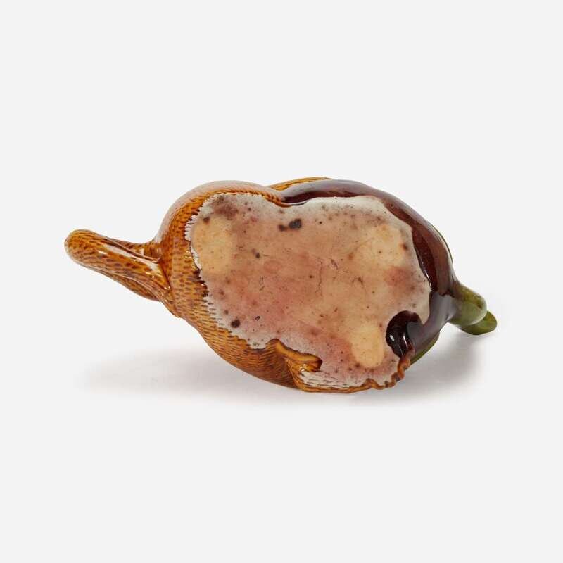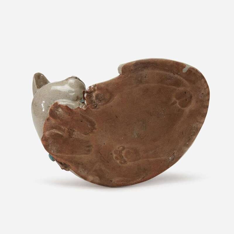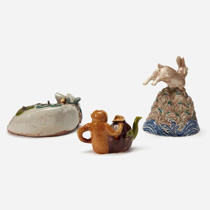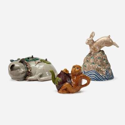 Comprising a large Japanese "Sleeping Cat" jar/censer with a pierced leaf-form cover, a Satsuma-style model of a hare leaping above rocks and waves, and a Chinese sancai-glazed "Monkey and Peach" teapot and cover.