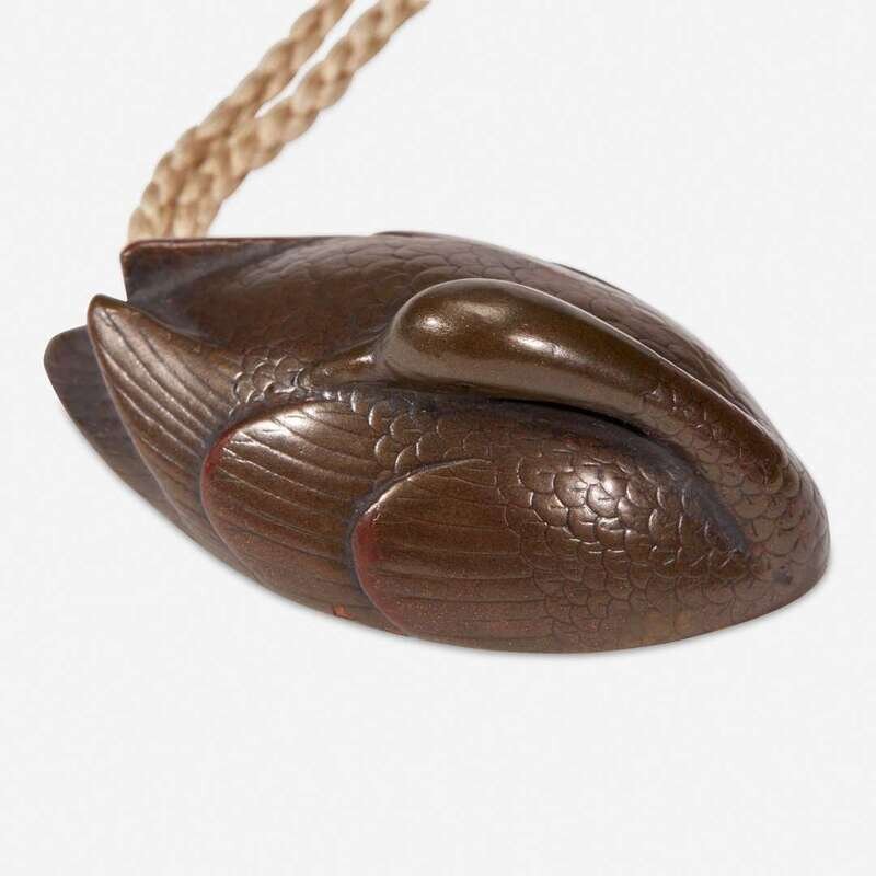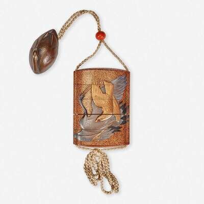The four-case inro finely decorated in gold, silver, and colored lacquer hiramaki-e, takamaki-e and okibirame with a hawk and crane, the other side inlaid with mother of pearl flowers, interior with fine nashiji; signed "Koma Koryu saku" with artist's kakihan, with an associated lacquer waterbird netsuke, and a coral ojime.