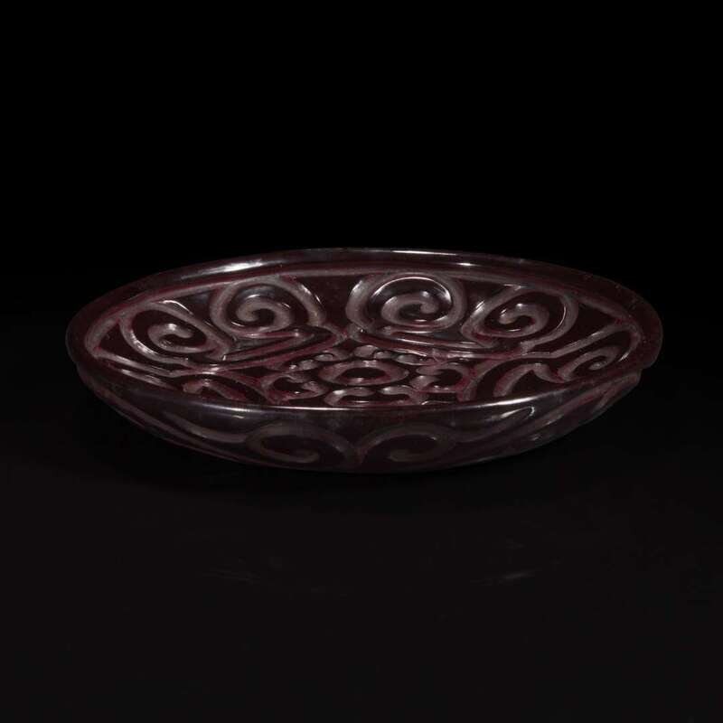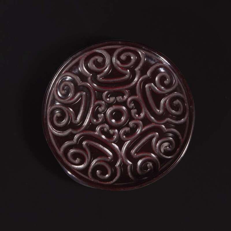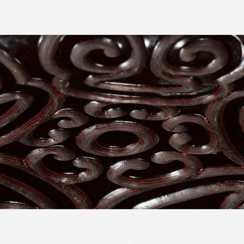 Of circular form, deeply carved through black and red lacquer layers with five ruyi or "sword pommel"-shaped cloud scrolls enclosing a five-lobed "florette' in the center, the exterior carved with continuous foliate scroll.